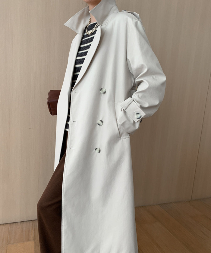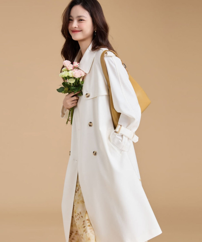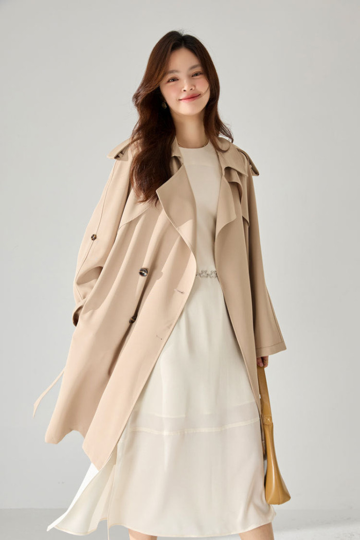 ドレープが縦ラインを強調し、すっきりとしたシルエットを叶えてくれるトレンチコート。体のラインを拾いすぎず、それでいて野暮ったく見えないバランスが魅力です。シンプルなパンツスタイルに合わせるだけで、洗練された大人の装いが完成します。