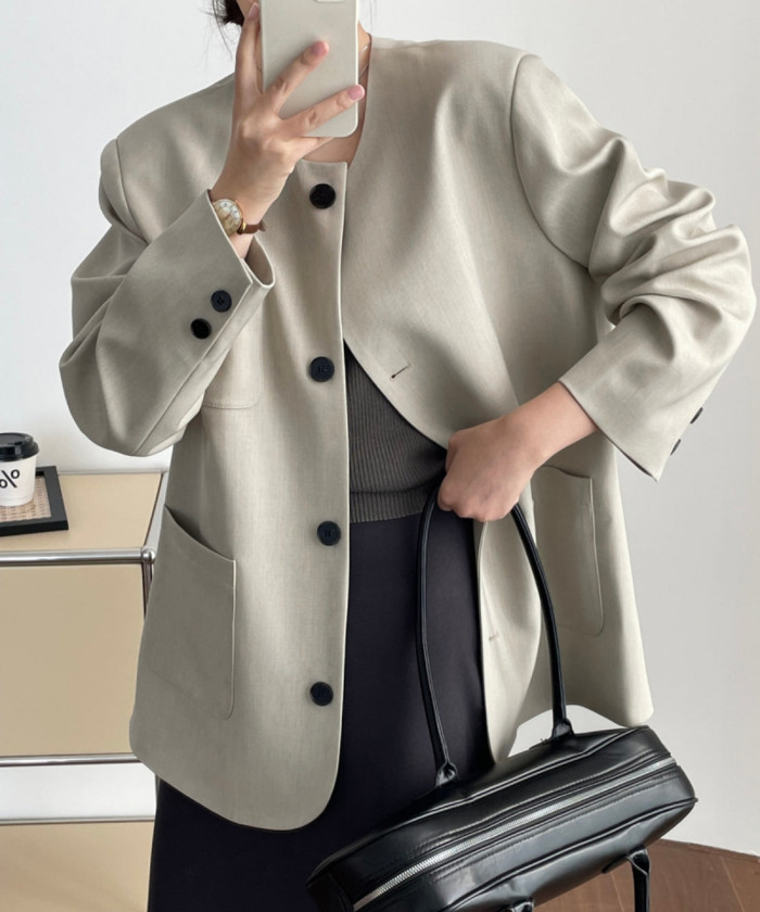 落ち着いたアプリコットカラーのノーカラージャケット。ダークカラーのボタンがアクセントになり、どこかレトロな雰囲気。Iラインのスカートと合わせてすっきりしたシルエットでまとめると大人フェミニンな印象に。