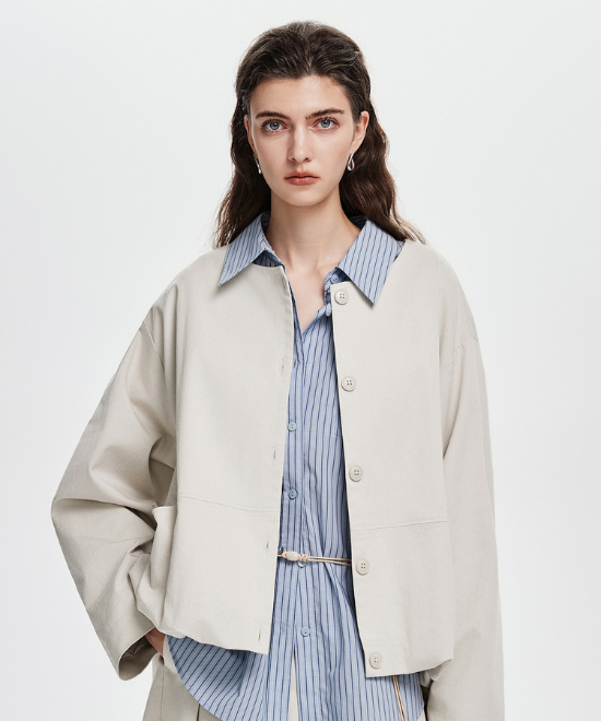 ホワイトみのあるベージュワントーンのこちらのジャケット。ラウンドネック×クロップド丈でどんなコーデにもマッチ。カラーのトップスをチョイスすれば遊び心あふれるこなれたスタイルに。