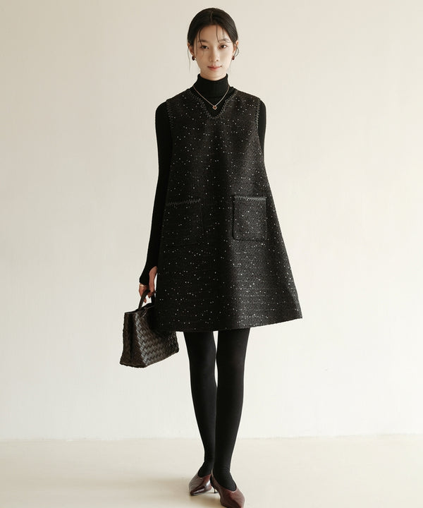 冬の特別なシーンで着たい煌めくベストワンピ。全体に施されたスパンコールとフレアなシルエットで女性らしくかわいらしい印象に。あえてオールブラックでまとめると甘くなりすぎない大人フェミニンなスタイルに。
