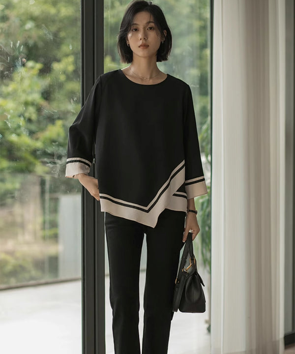 アシンメトリーなラインが目を引くブラック×ホワイト配色のブラウスは、着るだけで洗練された印象に。ボトムスもバッグもブラックをチョイスすれば、モノトーンの統一感が生まれ、ブラウスのデザイン性がより際立ちます。シンプルながら存在感のある大人コーデが完成します。