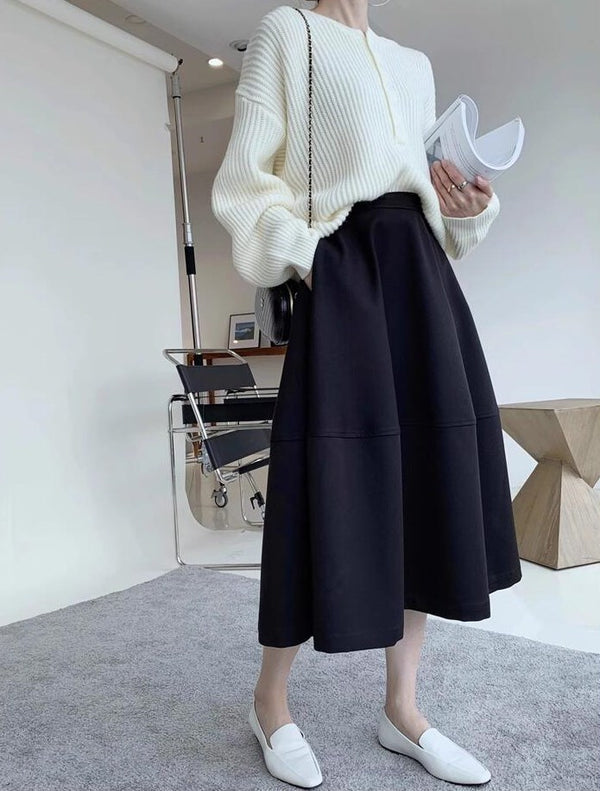 ハイウエストのアンブレラスカートは、ふんわりと広がるシルエットでレッグラインを拾わず、体型カバーにも優秀。ホワイトのニットを合わせたモノトーンコーデなら、軽やかさと上品さを両立でき、大人らしい洗練スタイルが完成します。
