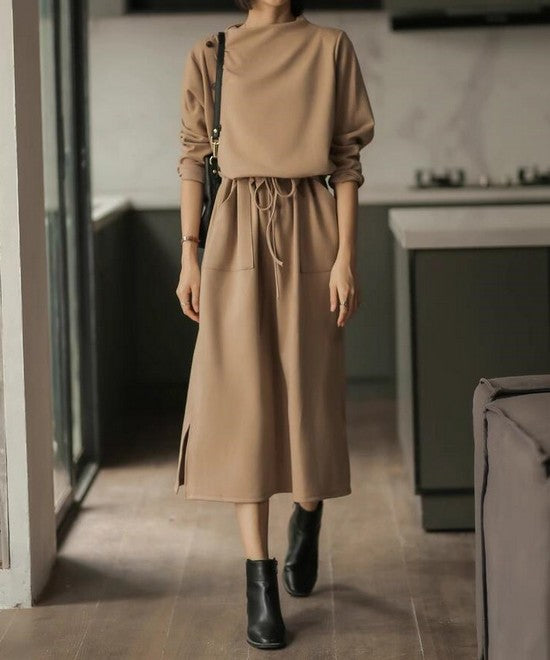 サイドボタン付きのストレートロングワンピースは、首つまりデザインで上品さを演出しつつ、縦ラインを強調してすっきり見え。キャメルの柔らかな色合いとウエストマーク効果で自然にメリハリが生まれ、気になる体型もさりげなくカバーできます。
