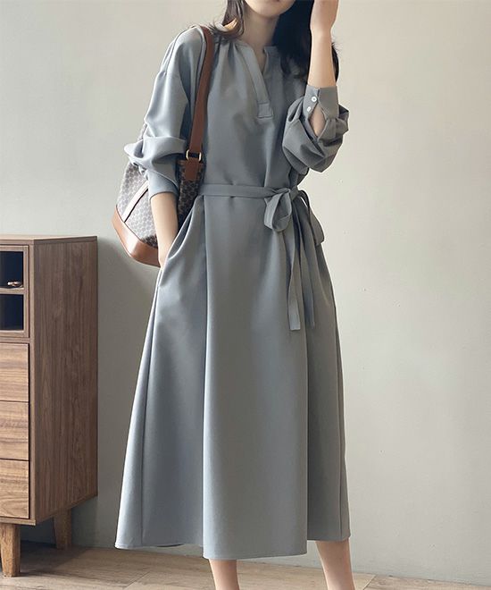 ライトブルーのロングワンピースは、きれいめな印象とリラックス感を両立できる一枚。ゆったりシルエットにリボンディテールを添え、スキッパーネックで首元はすっきり。シンプルながら上品さがあり、日常からお出かけまで幅広く活躍します。