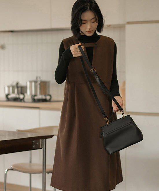 Aラインのウール素材ノースリーブワンピースは、レッグラインを拾わないシルエットで体型カバーに優秀な一枚。トレンド感のあるブラウンが大人の季節感を演出します。ブラックのインナーをレイヤードすれば全体が引き締まり、洗練された着こなしが完成しますね。
