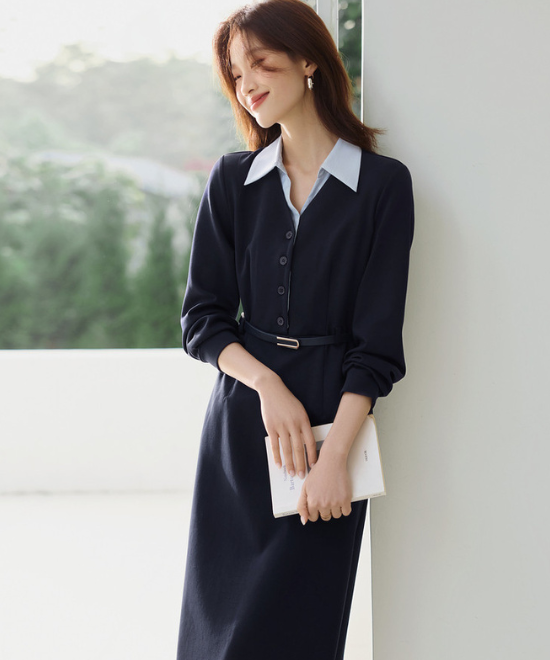 ライトブルーのシャツを重ねたように見えるフェイクツーピースデザインが印象的なネイビーのシャツワンピース。きれいめで品のある配色が大人の通勤スタイルにぴったりです。一枚でレイヤード風に決まり、忙しい朝も迷わずきちんと感を演出できます。