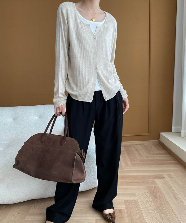 細リブのラウンドネックニットカーディガンは、カットソーをレイヤードすることでラフながら立体感のある着こなしに。ダークトーンのワイドパンツを合わせれば全体が引き締まり、シンプルながら大人らしいリラックス感とこなれ感の両立が叶います。
