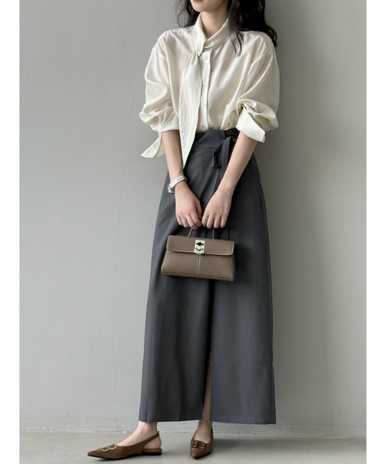 スリミングシルエットが上品なアプリコットカラーのシャツは、顔周りを明るく見せる華やかさが魅力。グレーのロングスカートを合わせれば、柔らかな色のコントラストで大人の落ち着きと上品さを両立した、きれいめスタイルが完成します。