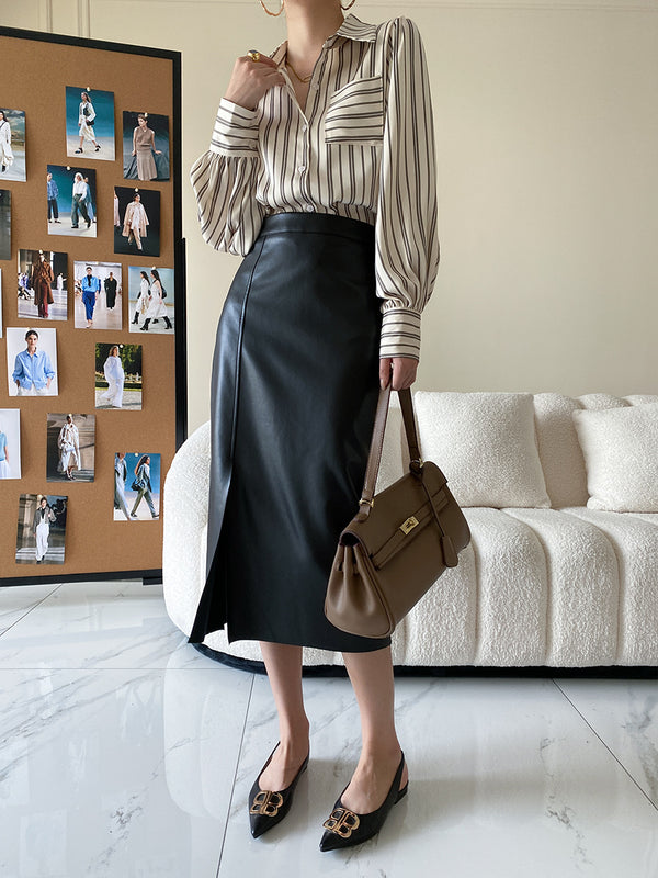 スリーブルーズのストライプ柄シャツは、ゆったりシルエットで抜け感を演出しつつ、オフィスでもきちんと感をキープ。ブラックのタイトスカートを合わせれば、全体が引き締まり、上品さとおしゃれさを両立した大人の通勤スタイルが完成します。