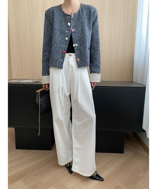 ノーカラーのショートジャケットは、シンプルながらランダムボタンがアクセントになり、コーデに表情をプラス。ホワイトのワイドパンツを合わせることで、グレーの落ち着きに軽やかさが加わり、全体のバランスがすっきり整います。淡色と中間色を組み合わせることで、大人らしい洗練された配印象に。