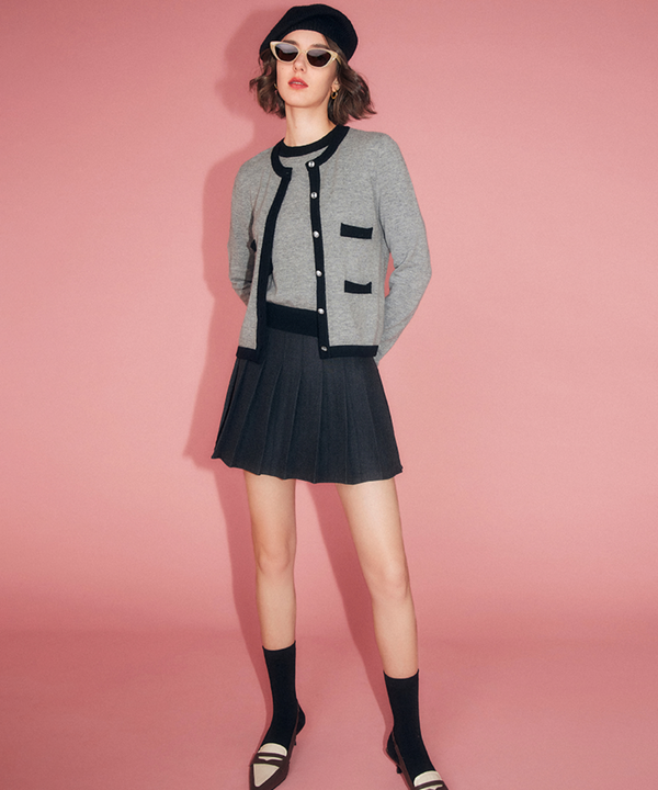 バイカラーニットカーディガンは、シンプルながらもメリハリのある一枚。ブラックのミニスカートを合わせれば、バイカラーのコントラストが引き立ち、全体が引き締まった印象に。グレーとブラックの落ち着いた組み合わせで、大人っぽく洗練された着こなしが完成します。