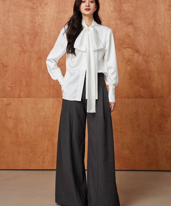 タック入りのグレー ワイドパンツは、ゆったりシルエットながら縦ラインを強調してすっきり見える一枚。ホワイトのブラウスを合わせることで顔周りが明るくなり、ボトムスにダークカラーを持ってくることで全体が引き締まり、大人の上品なバランスコーデに仕上がります。