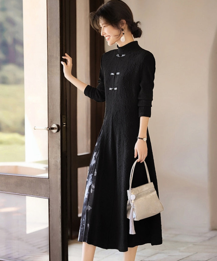 チャイドレスを思わせるデザインと、シックなブラック×藍色のカラーリングがマッチして、とても上品なワンピース。おしゃれデザインでも、ハイネックで首元が暖かいのが嬉しいですね。