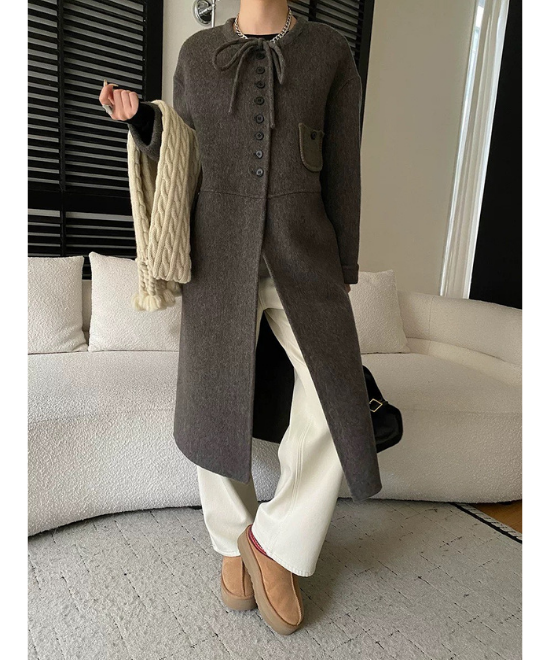 グレーカラーのウールコート。首元のリボンタイがアクセントになっています。連なったボタンとポケットが個性的。