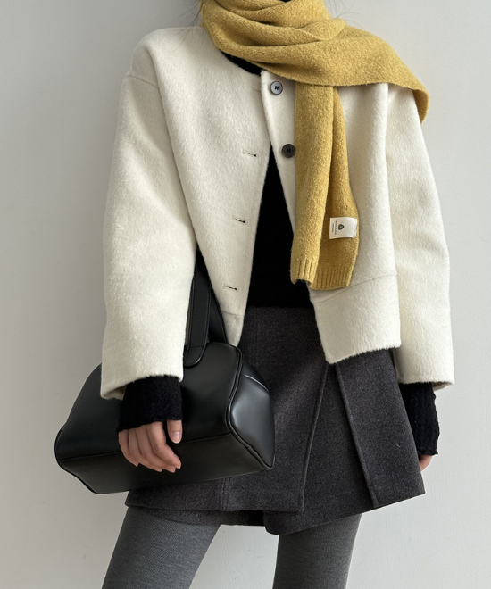 ショート丈のノーカラージャケット。ホワイトカラーが柔らかい雰囲気を与えてくれます。ミニスカートを履いて、スタイリッシュに。
