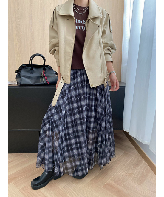 アプリコットカラーのレザージャケット。革の表面に艶を抑える処理がされているので、自然で落ち着いた風合いがあります。チェック柄のロングスカートと合わせて、甘辛ミックスなコーデに。