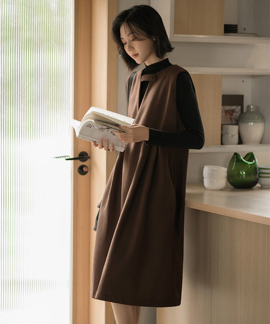 首元のボタンデザインが特徴的なAラインドレス。切り返しがウエストあるので、脚長効果も。インナーをブラックにすることで、落ち着いた雰囲気になります。