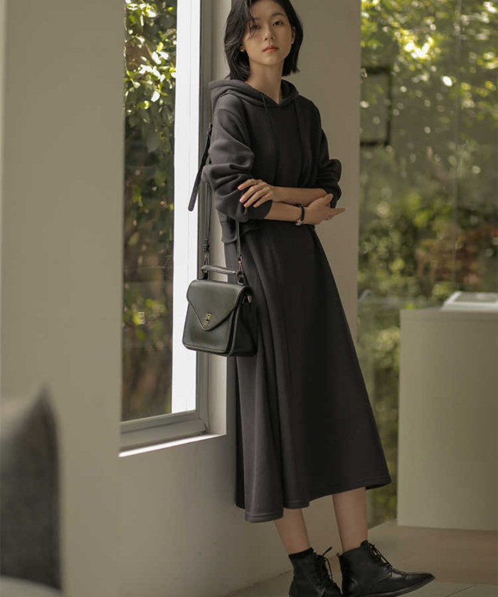 フードが付いているのが特徴的なスウェットワンピース。サラッと1枚で着てカジュアルなコーデになります。ブラックのアイテムと合わせてモダンな雰囲気に。