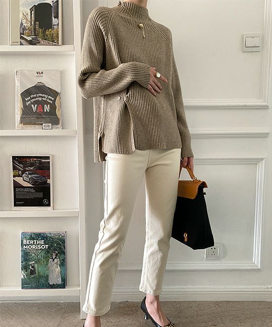 サイドスリットが効いたデザインニットは、肌なじみの良いベージュでやさしい印象に。ハイネックが顔周りまでしっかり暖めてくれるうえ、リブ編みが縦ラインを強調してすっきり見えを叶えます。防寒と細見えを両立できる、冬に頼れる一枚です。