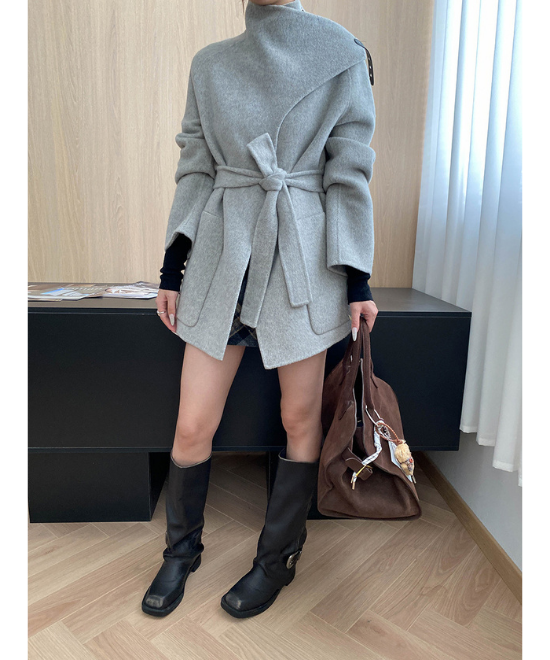 ケープスタイルが目を引くスタンドアップカラーのミドル丈コート。ライトグレーの柔らかな色合いが軽やかさを添え、ミニスカートと合わせることでバランスの取れた今っぽい着こなしに仕上がります。