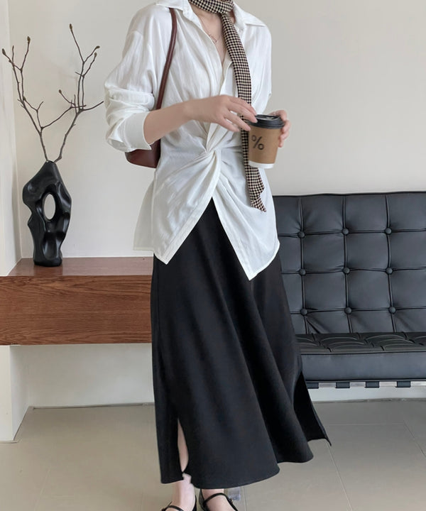 ウエストのひねりデザインがさりげなく個性を添えるホワイトシャツ。シンプルな中に程よいデザイン性があり、きちんと感も備えているのでオフィススタイルにも取り入れやすい一枚です。モノトーンでまとめれば、洗練された大人のおしゃれが完成。
