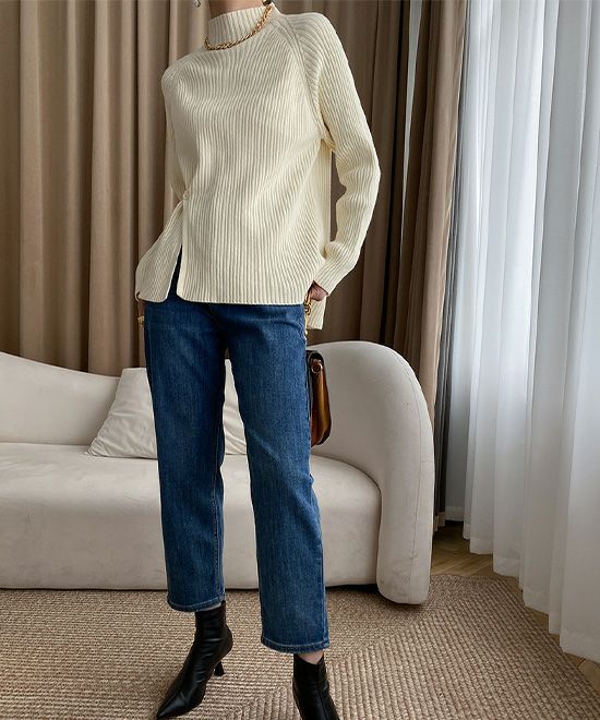 サイドスリットがさりげないアクセントになるホワイトのデザインニット。リブの縦ラインがシルエットをすっきり見せ、動きのある表情をプラスします。デニムパンツ合わせでもラフになりすぎず、バランスの取れた着こなしに仕上がります。
