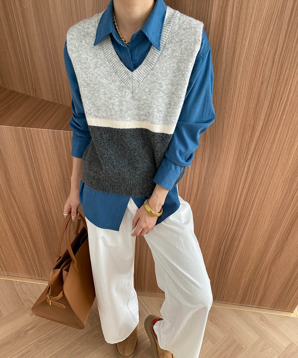 淡いグレーと濃いグレーの配色が目を引く、コントラストカラーのVネックニットベスト。個性的ながら取り入れやすく、ブルーのシャツをレイヤードすることで奥行きのある着こなしに。シンプルなアイテム合わせでも、存在感のあるスタイルが完成します。