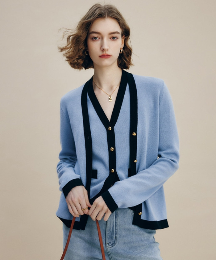 上品なくすみ感のあるブルー×全体が引き締まって見えるブラックのバイカラー配色で、エレガントさと大人っぽさを演出できるカーディガン。ウール100%の素材感は、「とにかく寒い」というあなたを温める大きな手助けになります。室内の肌寒さにも、アウターの下に着ても、防寒対策をおしゃれにできるのです。