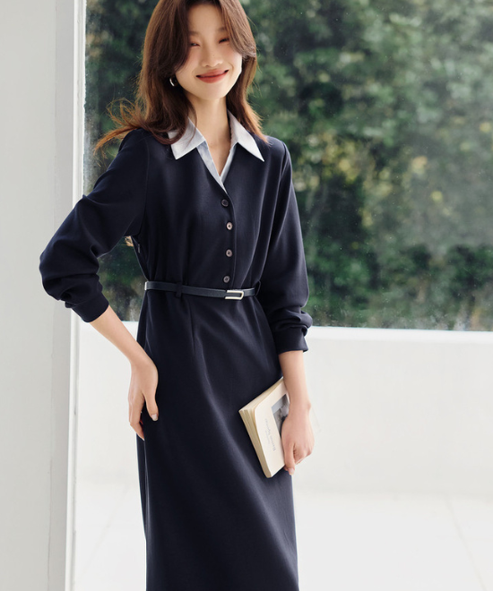 きちんと見えと女性らしさが叶う1枚。襟元の白が顔まわりを明るくし、ネイビーの落ち着きが知的な印象に。ウエストベルトでスタイルアップも。オフィスや式典、年末の集まりにも頼れる存在です。