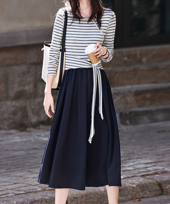 カットソーとフレアスカートの異素材ドッキングが技あり。ボーダー柄が抜け感をつくり、ウエストリボンで女性らしさをプラスしてくれます。スニーカーやブーツとも好相性でデイリーに活躍!