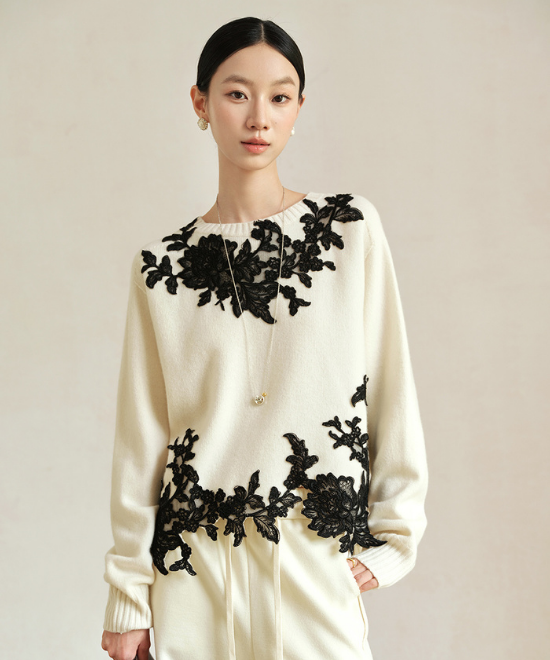 レースの立体刺繍が目を惹く、大人可愛い一着。ホワイトとブラックのコントラストが効いて、甘すぎない上品さが魅力的。シンプルなパンツと合わせるだけで、気品漂うお出かけスタイルに。