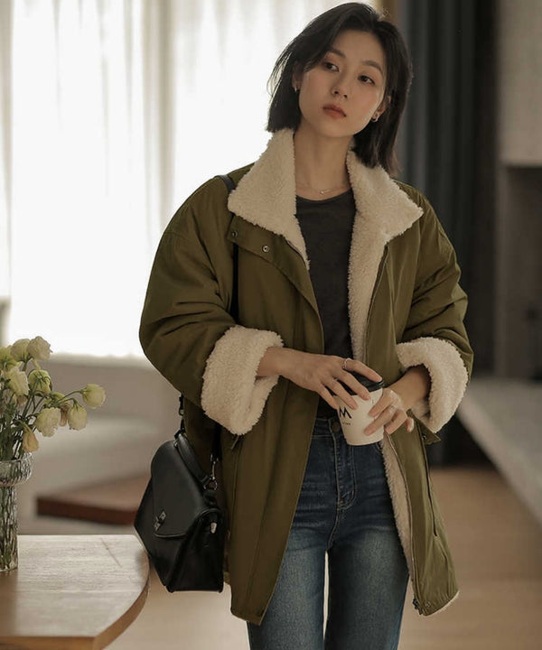 大きめのラペルとボアが顔まわりにボリュームを生み、小顔効果も狙えるカーキアウター。ゆるっとシルエットが旬なムードで、細身のパンツと好バランス。デイリーに頼れる一着!