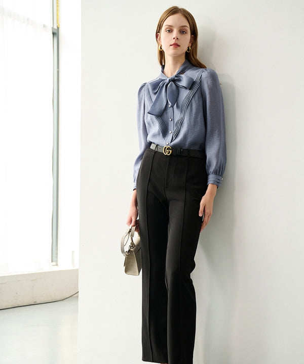 ボウタイとピンタックデザインが上品な印象のブラウス。リボンのディテールと、くすみブルーの色味がほどよく華やかで、色物でも通勤コーデに取り入れやすい一枚です。ブラックのスラックスを合わせれば、全体が引き締まり、きちんと感のある着こなしに仕上がります。