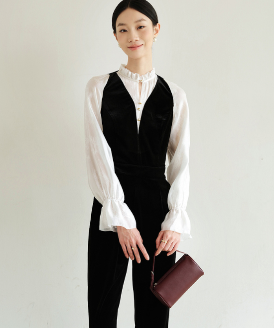 落ち感のあるベルベット素材が、動くたびに上品な艶を生み出すジャンプスーツ。フェイクツーピース風のデザインが、重ね着をしているような奥行きを演出し、コーデを考えなくても装いが完成します。華やかさがありながらも落ち着いた印象で、式典や会食などにも自然に馴染む一着です。