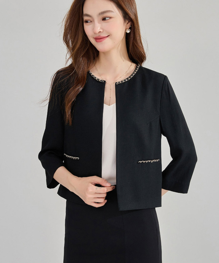 すっきりとしたノーカラーデザインに、さりげなく添えられたメタルチェーンが印象的なジャケット。主張しすぎない装飾が、シンプルなワンピースやブラウススタイルを引き締めてくれます。軽やかな七分袖で、室内外を行き来するオケージョンシーンにも取り入れやすい一枚です。