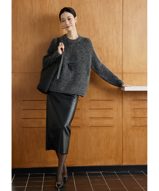 ふんわり柔らかなモヘアウール素材のルーズシルエットセーター。ゆったりした形が抜け感を作り、レザースカートを合わせることでダークカラーでも重たくならず、地味見えを回避できます。素材感とコントラストを活かした、大人の冬コーデにぴったりの一枚です。