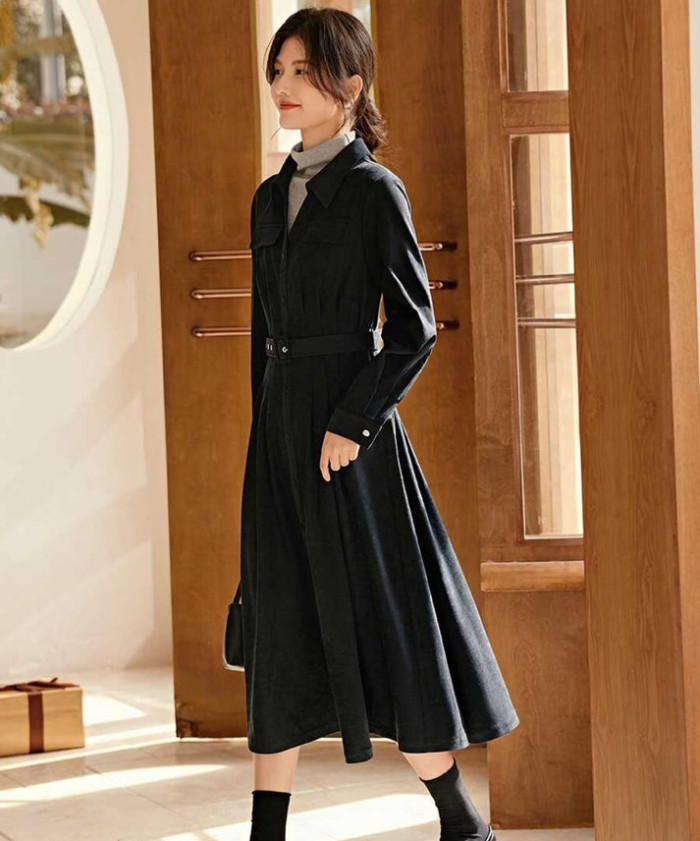 ネイビーカラーのシャツワンピース。ウエストのベルトがスタイルアップしてくれます。ハイネックを合わせて、快適なオフィスコーデに。