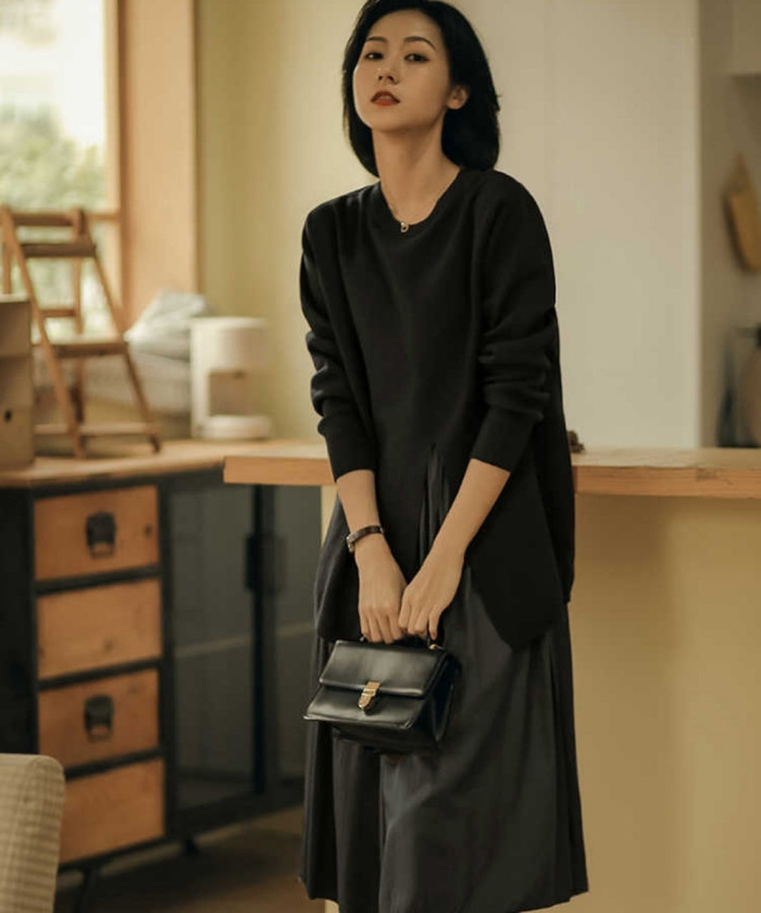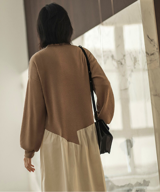 ニットと異素材のスカートをドッキングしたワンピース。ニット部分に深めのスリットが入ったアシンメトリーデザイン。上下半分のドッキングとは違って奥行きを感じるおしゃれな一着。同色同士でも異素材の組み合わせで単調にならずこなれた印象に。
