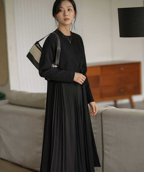 プリーツスカートをドッキングしたフェイクワンピース。高めに設定されたウエストから広がるプリーツスカートがエレガントで上品な一着。サイドには調整できるリボンがついていてウエスト周りにメリハリをオン。程よくきちんと感あるワンピースは人と会う機会が増えるこれからの時期にもぴったり。