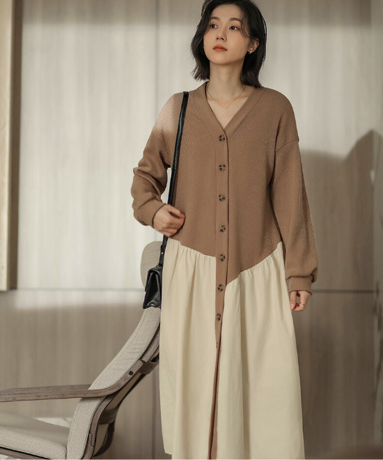 ニットと異素材のフレアスカートがドッキングされたデザインワンピース。スカートの裾に向かって長く伸びるボタンデザインやアシンメトリーなバッグスタイルなどこだわりの詰まった一着。デコルテをきれいに見せるVネックラインが女性らしく淡色同士の色合わせが優しい雰囲気に。