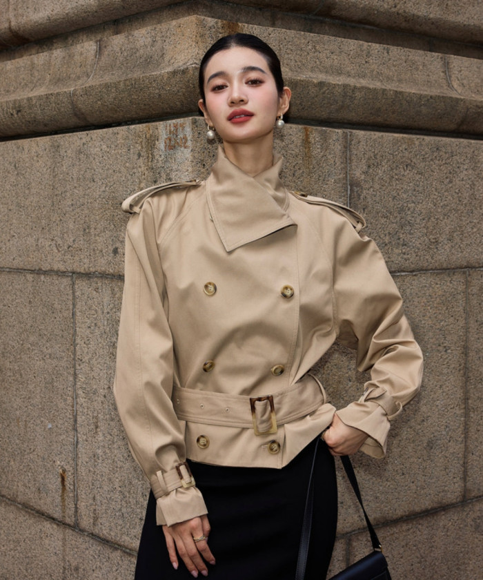 トレンチコートをバサッと切ったような潔さが個性的なショートジャケット。衿元はとても自由度が高い設計になっているので、アレンジ次第でいろいろな雰囲気を出すことができます。