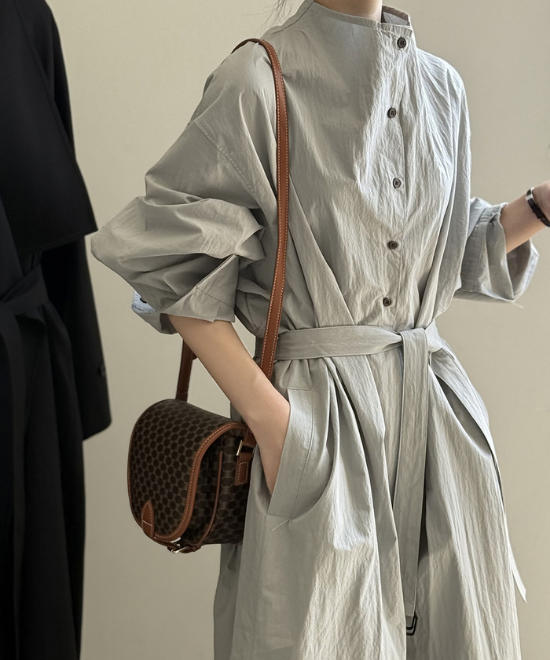 グレーブルーカラーのシャツワンピース。ヴィンテージ風がおしゃれです。ブラウンのショルダーバッグをポイント使いで。