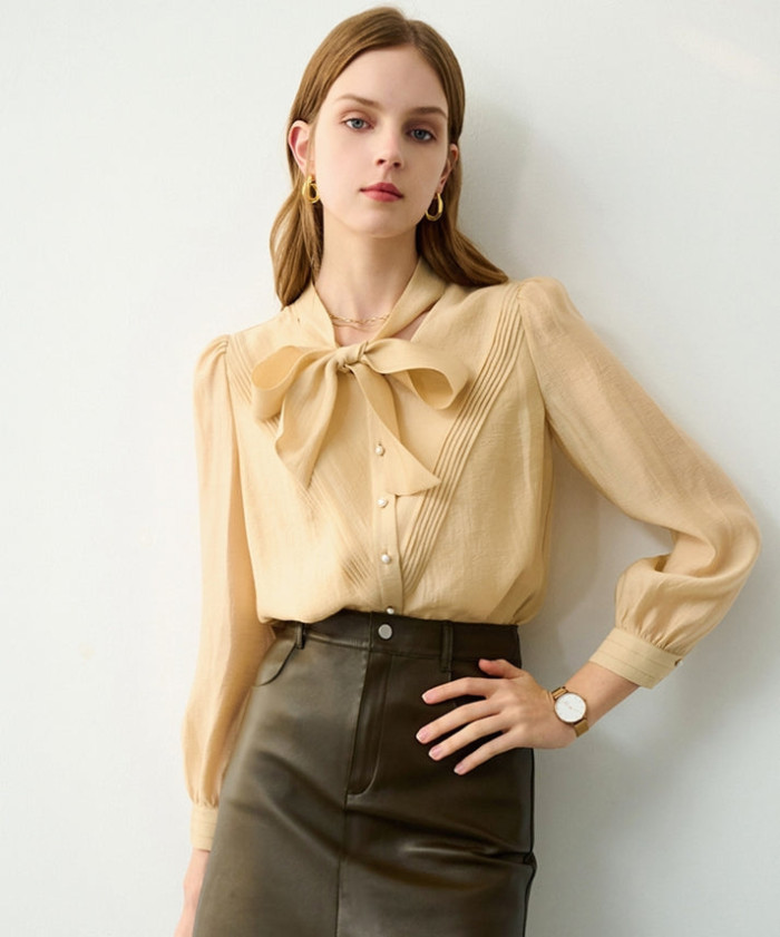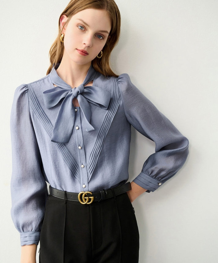 軽くて程よく透明感のあるシアー素材のボウタイブラウス。