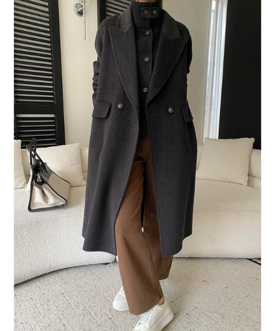 大きめ襟のトップスを首元からのぞかせて、ブラックのワイドデニム×ブラウンスニーカーを合わせれば、コートを主役にしたフェミニンカジュアルが完成!