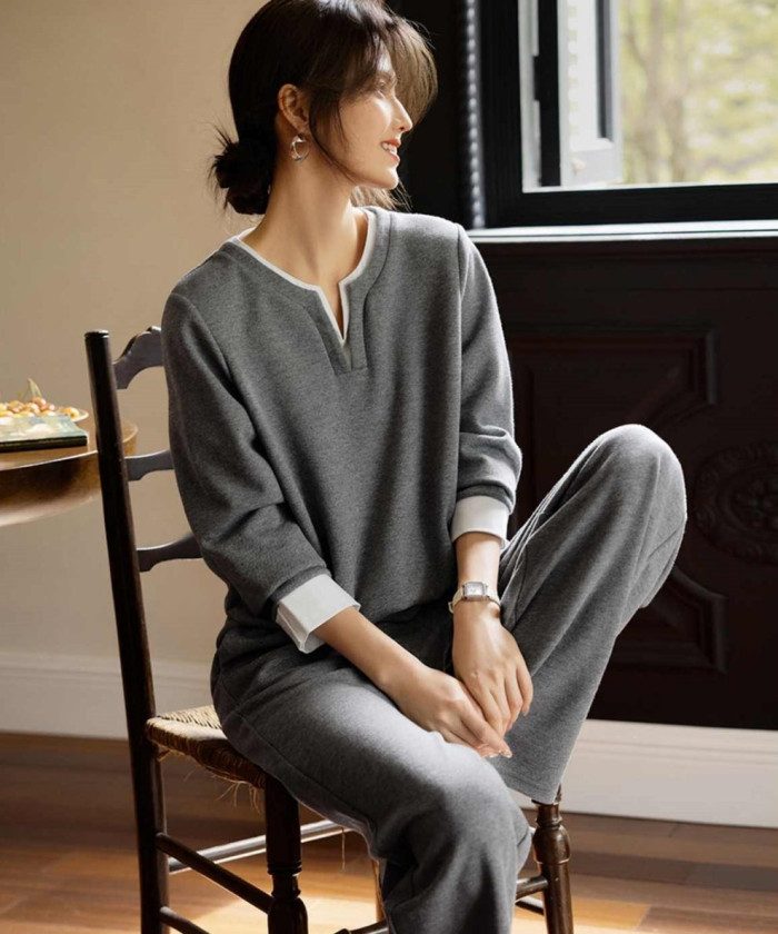 トップスとボトムを別々に考えなくても、自然とバランスが決まるセットアップタイプ。スウェット素材の気楽さがありつつ、配色や切り替えのデザインがシンプルすぎない印象をつくります。おうち時間はもちろん、宅配応対や近所へのちょっとした用事にも対応できる安心感があります。