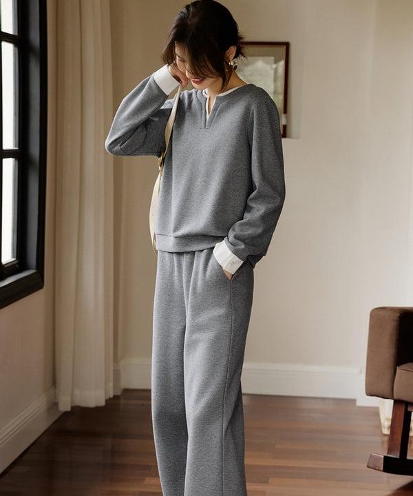 フェイクツーピース風のスウェットセットアップは、上下で着るだけでトレンド感のあるスタイルが完成。グレーのやわらかな色味とキーネックデザインが、スウェットでもきちんと見えを叶えます。ラクな着心地ながら大人っぽく着こなせる、こなれ感たっぷりの一着です。