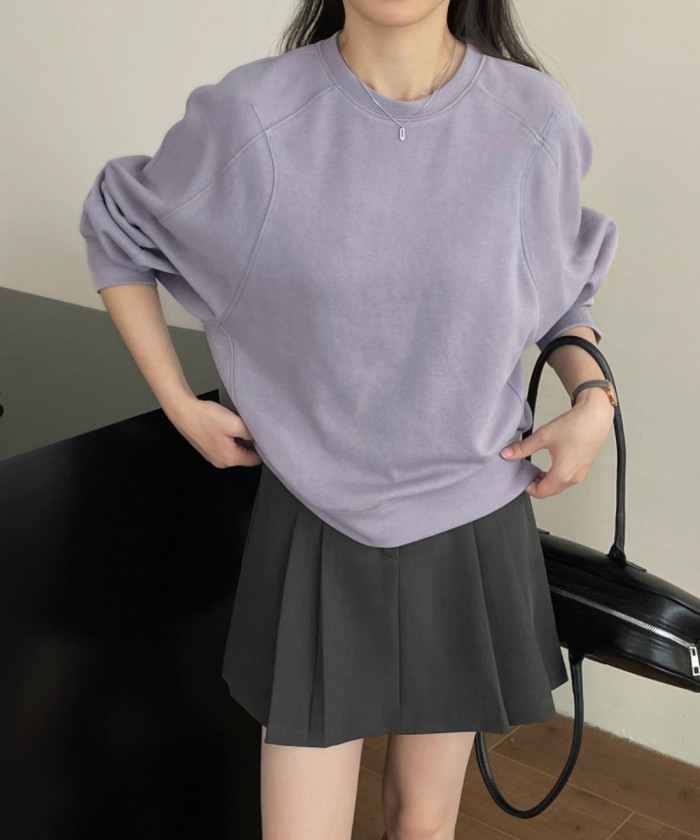 ラウンドネックのスウェットシャツは、やさしいパープルカラーでラフさの中に可愛げをプラス。ミニスカートと合わせることでバランスが取れ、カジュアルになりすぎず今っぽい着こなしに仕上がります。気負わず取り入れられて、自然とこなれ感が出るスタイリングです。