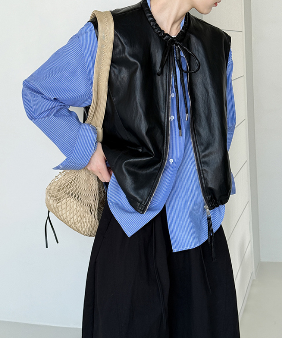 リボンディテールでレイヤードを楽しむレザーベスト