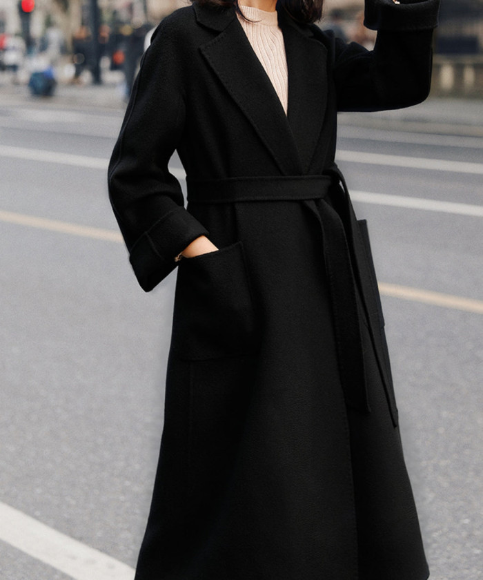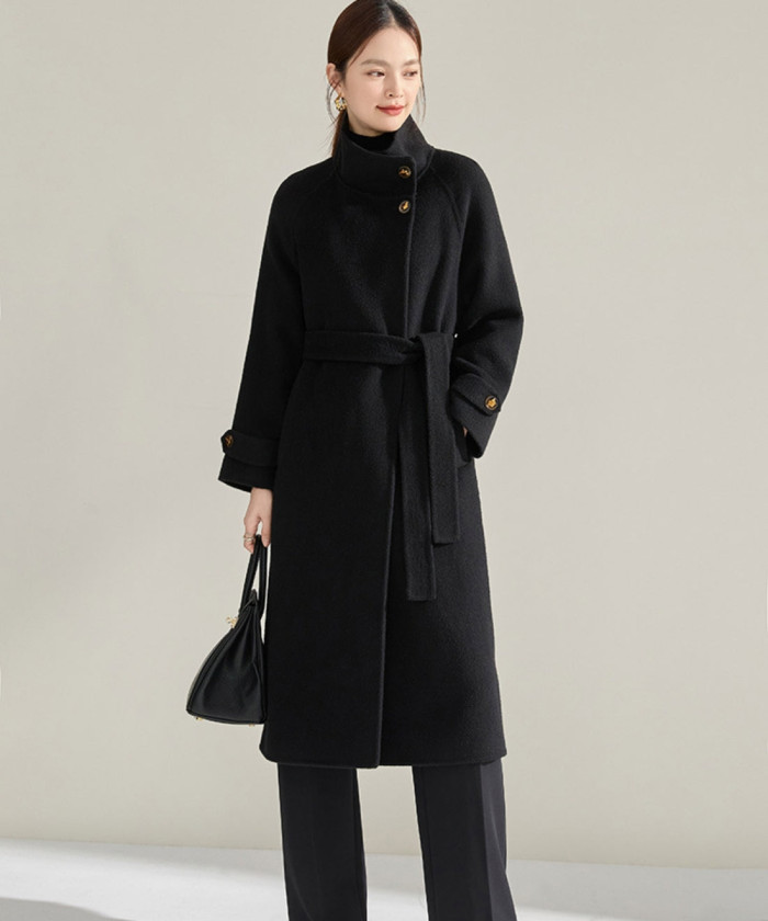 すっと立ち上がるスタンドカラーが、顔まわりを凛とした印象に導くロングコート。こちらもウール100%素材で、暖かさと上品さを両立しています。縦ラインを意識したシルエットは体型をすっきり見せてくれ、シンプルなコーディネートでも大人らしい存在感を演出できます。