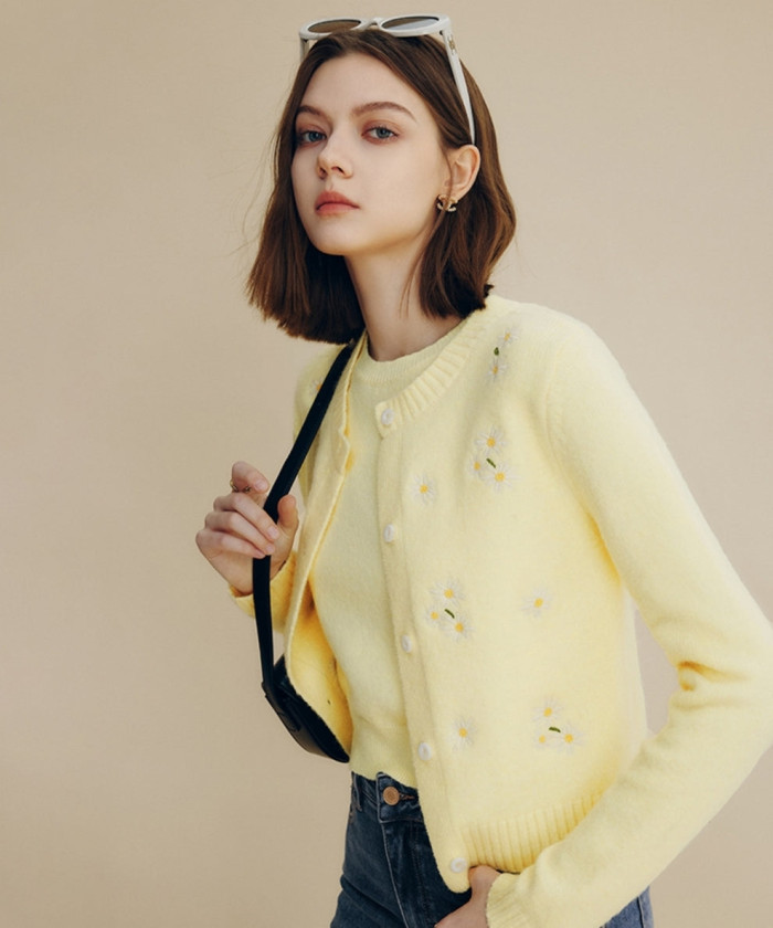 可憐なデイジー刺繍がアクセントになったカーディガンは、羽織るだけで装いに明るさをプラス。主張しすぎないデザインなので、きれい色でも上品にまとまります。インナーをシンプルにすれば刺繍が程よく引き立ち、季節の変わり目にも頼れる存在です。